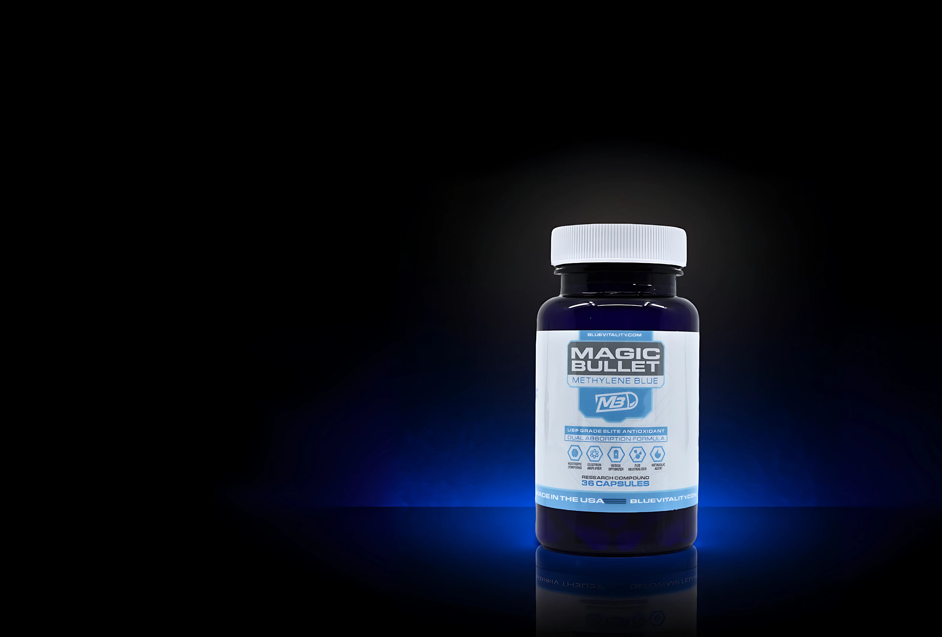 Magic Bullet is a premium daily supplement combining Methylene Blue and Alpha Lipoic Acid to support cellular energy, cognitive clarity, and antioxidant defense.